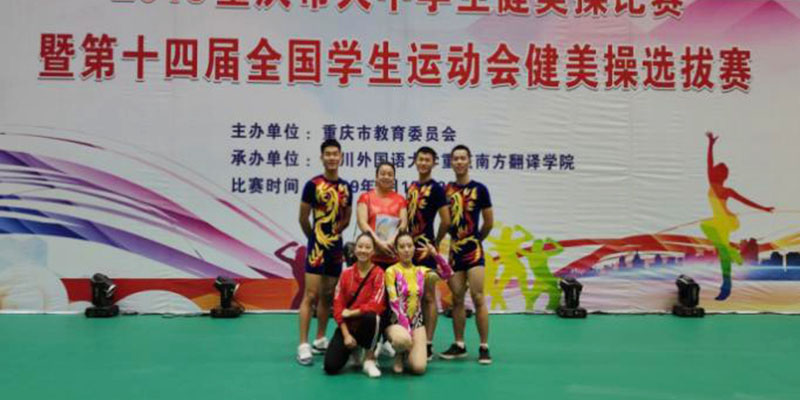 日前,由重庆市教育委员会主办的“2019重庆市大中学生健美操比赛暨第十四届全国学生运动会健美操选拔赛”在四川外国语大学南方翻译学院举行,我校健美操队5名队员分别参加了大学组男子单人、女子单人、混双及男子三人团体赛等项目。经过激烈角逐,我校健美操代表队获得大学丙组(专业组)女子单人、混双、男子三人三项亚军,男子单人获得大学丙组第三名。