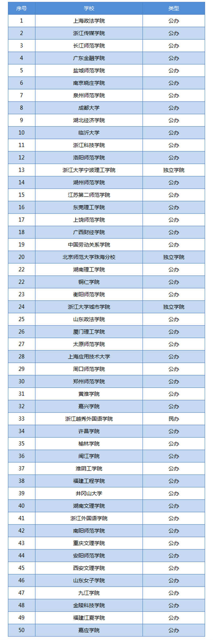 “中文社会科学论文”数据来源于“中文社会科学引文索引”(CSSCI)数据库。CSSCI数据库由南京大学中国社会科学研究评价中心开发研制而成, CSSCI从全国的中文人文社会科学学术性期刊中精选出学术性强、编辑规范的期刊作为来源期刊。 “中国新建(应用型)本科高校综合竞争力排行课题组”(ICAUR)由国内高等教育研究权威专家、部分应用型本科高校书记校长组建,课题组致力于我国新建(应用型)本科高校的评价研究,推动我国新建(应用型)高校实现高水平发展。我国新建(应用型)本科高校中文社会科学论文排行榜前50强见下表。