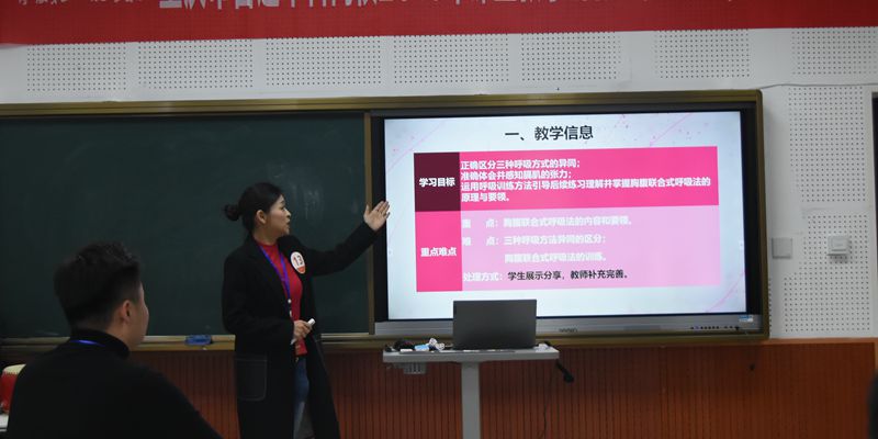文科青年组比赛中,我校许芫颜老师授课主题为《胸腹联合式呼吸法的控制与训练》。她采用BOPPPS教学设计模式,打破以往“师傅带学生”的模式,巧妙运用快板、锣鼓等工具带动课堂氛围,激发学生学习兴趣,整体课堂氛围热烈活跃,获得了评委老师的一致好评。