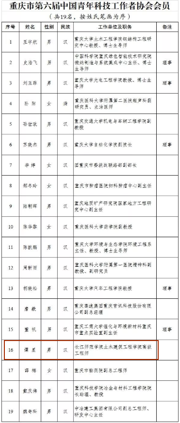 大会审议通过了协会工作报告、《中国青年科技工作者协会章程(修正案)》,并选举产生新一届理事会。经各学校和重庆市青联推报、中青科协审查,重庆19名青年科技工作者入选中青科协会员,5名当选理事。其中,我校谭星博士入选中青科协会员。