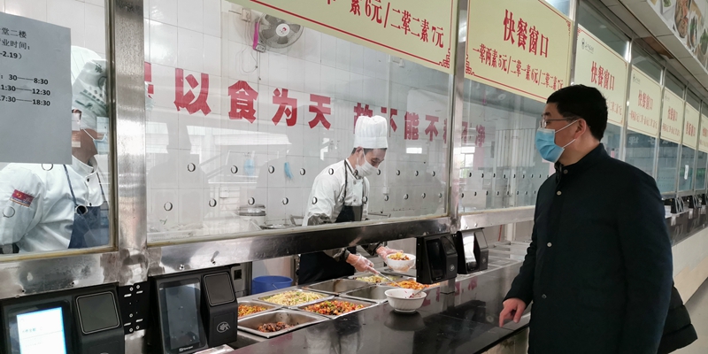 在学生食堂,蔡校长一行认真查看了菜品、后厨等,问询了食堂消毒防疫的情况。蔡校长指出,食堂的正常运转为留校师生提供了用餐保障,这离不开坚守岗位、辛勤付出的工作人员。他强调,食堂一定要做好消毒工作,注意生熟食的制作,同时要思考开学后的工作预案,保障师生的用餐安全。