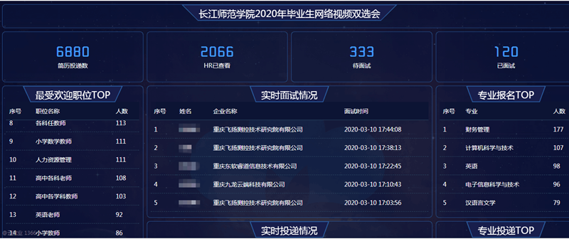 3月10日,我校顺利举行网络视频双选会,181家优质企事业单位参与线上招聘,我校3000多名应届毕业生在线注册、应聘,投递简历6800余份。这是我校在疫情防控情况下,积极应对就业新常态和新变化的有效举措,确保就业工作不离线、学生求职不断线。