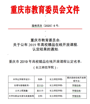 近日,重庆市2019年高校精品在线开放课程评审认定结果揭晓,我校《中学化学教学设计》《乐理与视唱练耳》《土木工程测量》《大学生职业生涯与发展规划》4门课程入选“重庆市第三批高校精品在线开放课程”。在重庆市已公布的三批精品在线开放课程中,我校每批均有课程入选,截至目前,共有8门在线开放课程被认定为“重庆市精品在线开放课程”,一流课程建设成绩初显。