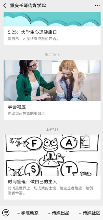 传媒学院四名辅导员积极策划“云指导”,通过智慧校园推介“如何检索信息”“预防感冒小妙招”“学习干货”“时间管理”等主题内容,将生动形象的视频与关怀满满的文字结合,指导同学们更好地学习生活,激励大家在新学期努力学习、奋勇争先。