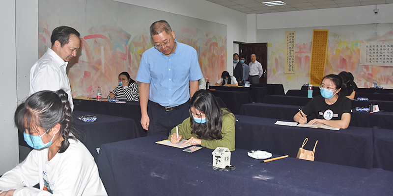 在教师教育学院实训中心,黄政一行参观了远程观摩室、智能化粉笔训练室、书写技能训练室、智能化钢笔毛笔训练室等。在书写技能训练室,黄政走到正在练习书法的学生身边,亲切询问学生的学习情况,并称赞了同学们的书法作品。在智能化钢笔毛笔训练室,黄政体验了智能化练字设备,高度评价了该设备的先进性、科学性。黄政强调,师范生要注重基本功的训练,师范类高校应该高度重视教师教育,优化课程体系、人才培养体系,为国家培养新时代的优秀教师。