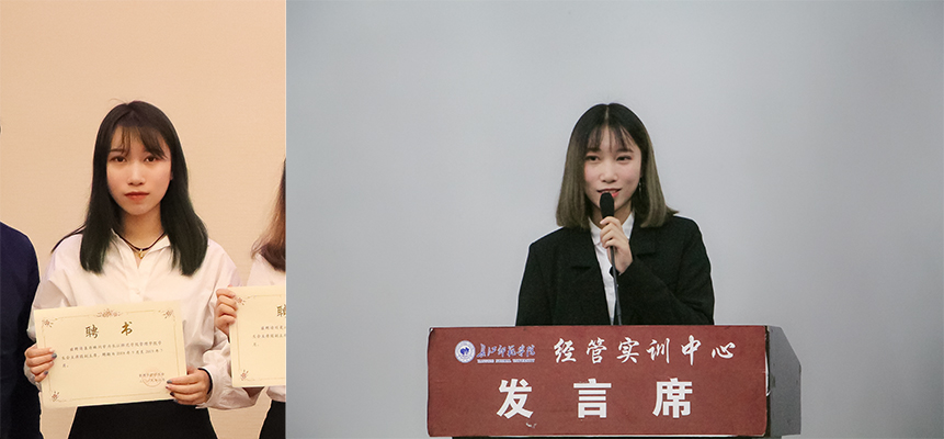 左图为袁丹琳大三上台接受聘书,右图为袁丹琳大四上台发言