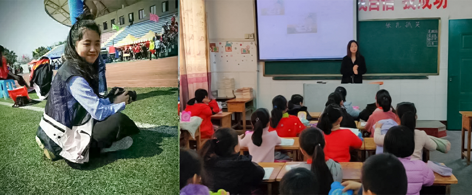 左图为刘瑶大一参加校运动会拍摄任务,右图为刘瑶大四开展专业见习