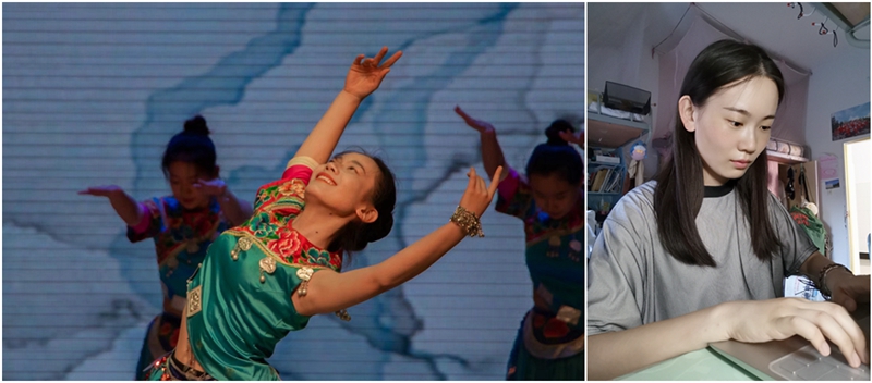 左图为丁莉进校时参加活动演出,右图为丁莉大四在寝室撰写材料