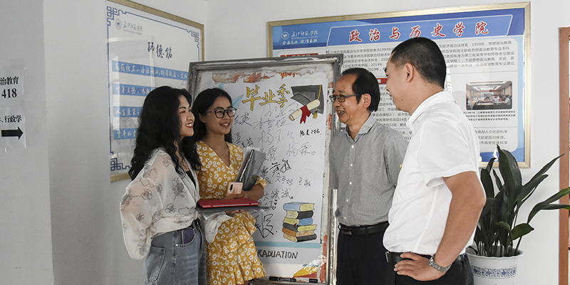 离校在即,文学院毕业生前往老师办公室道别,为老师送去鲜花,感谢老师的悉心栽培,并在学院准备的寄语展板前合影。