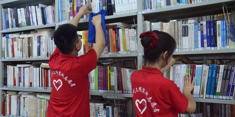 校团委青年志愿者服务团的志愿者们正在清理图书,打扫图书馆。