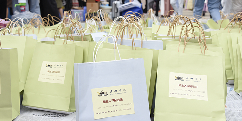 传媒学院在迎新点设置了“卡通相框”,并为每个新生拍摄入学的第一张照片。该院还别出心裁地准备了“新生入学贴心包”,里面装有院服、笔记本、入学指南等,满是老师们的关爱和期盼。