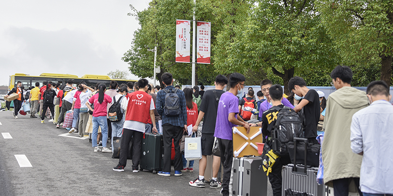 根据国家疫情防控要求,今年新生统一在学校南门报到,新生家长不能进入校园。为了减轻同学们的负担,学校设置了迎新点、摆渡车点、宿舍接待点,并安排了多名志愿者帮助新生搬运行李,引导新生入住寝室,报到流程十分高效、顺畅。