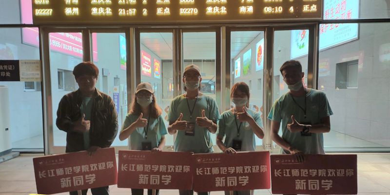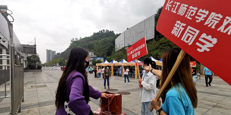 学生工作部在涪陵动车北站、涪陵火车南站、涪陵高速路口等交通枢纽点设置接待点,老师与志愿者们高举标志牌,指引、接送新生们顺利抵达学校南门集中报到点。