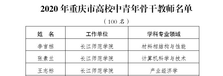 日前,2020年重庆市高校中青年骨干教师名单正式揭晓,全市共有100名教师入选,我校教师李言栋、王志标、张素兰光荣入选。截止目前,我校已有26名教师入选重庆市中青年骨干教师。