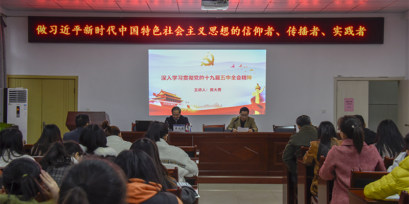 根据学校的实际情况,黄书记对全校学习贯彻全会精神提出四点要求:一要准确把握十九届五中全会的精神实质的六个“新”,即新形势、新阶段、新理念、新目标、新任务、新要求;二要迅速掀起学习宣传贯彻党的十九届五中全会精神热潮,抓好学习、宣讲、宣传、阐释、落实;三要编制并实施好学校“十四五”事业发展规划,坚持问政于师生、问需于师生、问计于师生;四要用党的十九届五中全会精神引领学生成长成才,加强理论学习、坚定理想信念、练就过硬本领、强化责任担当。