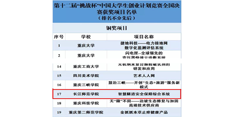 近日,由共青团中央、中国科协、教育部、全国学联主办的第十二届“挑战杯”中国大学生创业计划竞赛决赛在吉林大学圆满落幕。我校大数据与智能工程学院学子的参赛项目《智慧隧道安全保障综合系统》荣获大赛铜奖。
