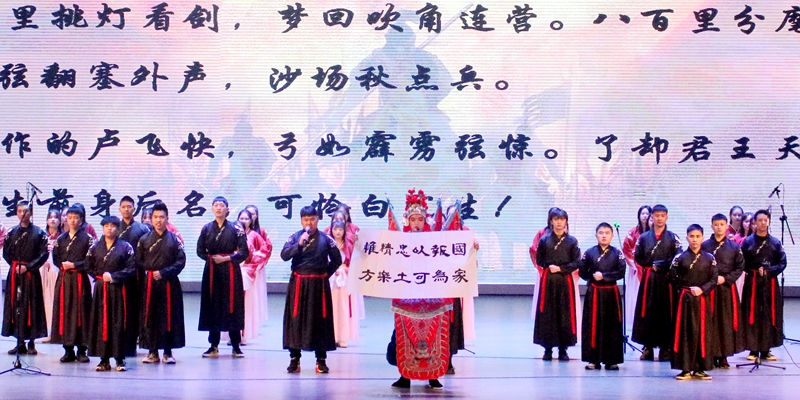 在悠扬的乐曲声中,参赛团队将国学经典篇目用诵读、乐器、舞蹈等形式进行演绎。《君酒天》以古为鉴,表达出为理想砥砺奋斗的人生追求;《盛世中华》将中华民族饱经磨难却生生不息,努力拼搏、团结一心的民族精神表达得淋漓尽致;《用残损之躯,筑英雄之城》激励着青年学子做有理想、有信念、有担当的新时代新青年;《踏泽而征,予衫偕行》把沙场将士和逆行的白衣战士的形象巧妙融合在一起,生动表现了古今英雄的形象,体现了华夏儿女在困难面前无所畏惧、逆流而上的勇气。