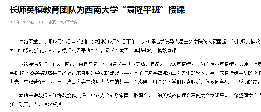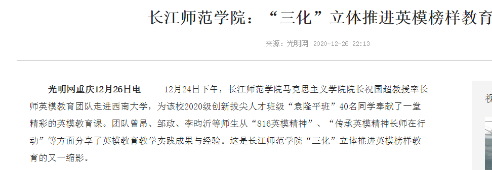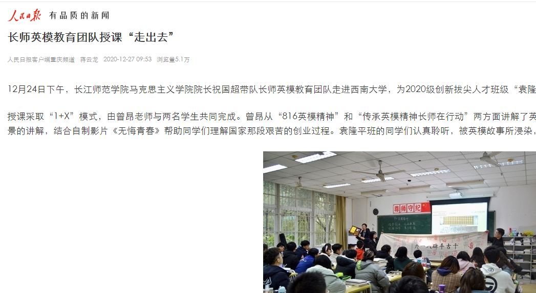 日前,我校马克思主义学院英模教育团队开启“走出去”模式,深入大中小学、企事业单位讲授英模教育课,引发强烈反响,得到了人民日报、光明网、中国新闻网、重庆日报等权威媒体的报道“点赞”。