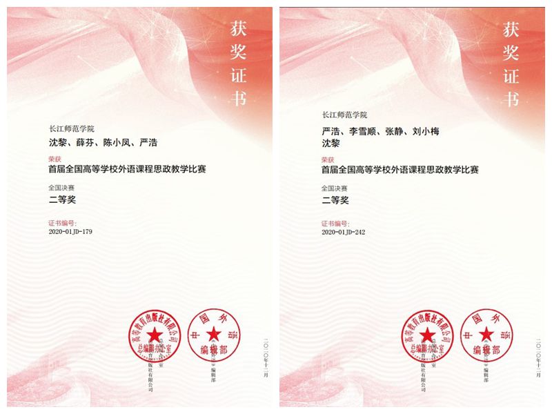 日前,首届全国高等学校外语课程思政教学比赛圆满落幕,我校大学外语教学科研部教师沈黎、严浩分别领衔申报的2项参赛成果均获得二等奖。