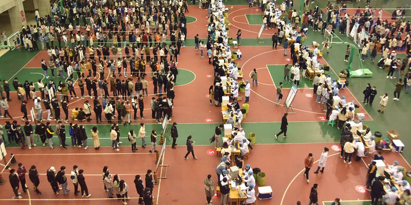 3月21日,我校在弘毅体育馆组织师生员工接种新冠病毒灭活疫苗。体育馆内设置了30个接种台,师生员工分时段、分批次入场接种。据统计,12622名师生员工预约接种,截至21日21:00,10935人完成接种。