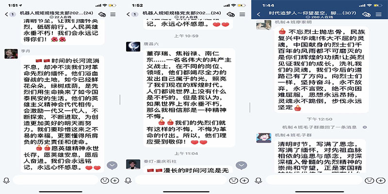 机器人工程学院结合专业特点开展“云纪念”活动,全院师生线上观看经典视频,听老师讲述中国共产党开天辟地、改天换地、翻天覆地、惊天动地的光辉历史,同学们在线上向先贤先烈致敬、发表感言,表达对老一辈革命家、革命先烈和英模的缅怀之情,以及继承先烈遗志、做一个具有奉献精神、能担当民族复兴大任的时代新人的宏大志向。