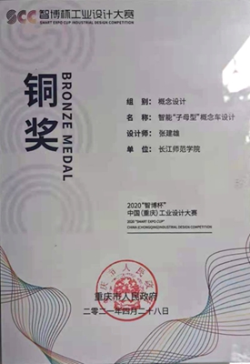 4月28日下午, 由市人民政府主办,市经济和信息化委员会与巴南区人民政府共同承办,以“智能设计、智汇重庆”为主题的2020“智博杯”中国(重庆)工业设计大赛颁奖典礼顺利举办。我校机器人工程学院教师张建雄荣获概念设计类铜奖,代表重庆企业、院校及个人获得唯一一个概念设计类奖项。