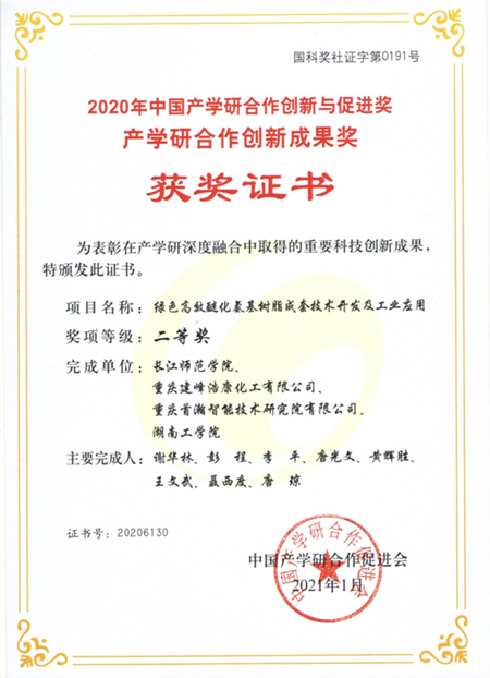 近日,我校与重庆建峰浩康化工有限公司等单位共同完成的“绿色高效醚化氨基树脂成套技术开发与工业应用”产学研合作项目,被中国产学研合作促进会授予2020年度中国产学研合作创新与促进奖——产学研合作创新成果奖二等奖。我校为第一完成单位,谢华林、彭程、黄辉胜等老师为核心研发成员。目前,该项目已在重庆建峰浩康化工有限公司获得成功应用,产生了显著的社会经济效益。