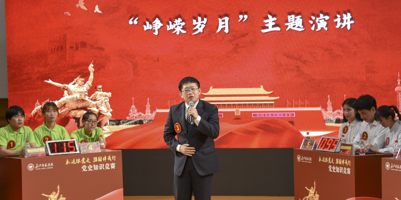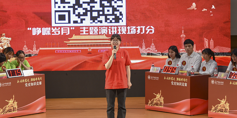 上午9:00,各教学院(部)参赛师生在崇礼楼113教室进行理论测试,测试成绩排名前8名的代表队进入现场竞答环节。下午14:30,8支代表队在音乐厅进行现场竞答,逐一参加双人挑战答题(星火挑战)、个人挑战答题(砥砺前行)、主题演讲(峥嵘岁月)、团队抢答题(日新月异)4个环节。