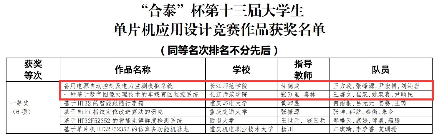 近日,由市教委主办的“合泰”杯第十三届重庆市大学生单片机应用设计竞赛在重庆邮电大学举办。经过激烈角逐,我校电子信息工程学院学生团队荣获2项一等奖,陈吕豪老师获得“优秀组织工作者”称号。
