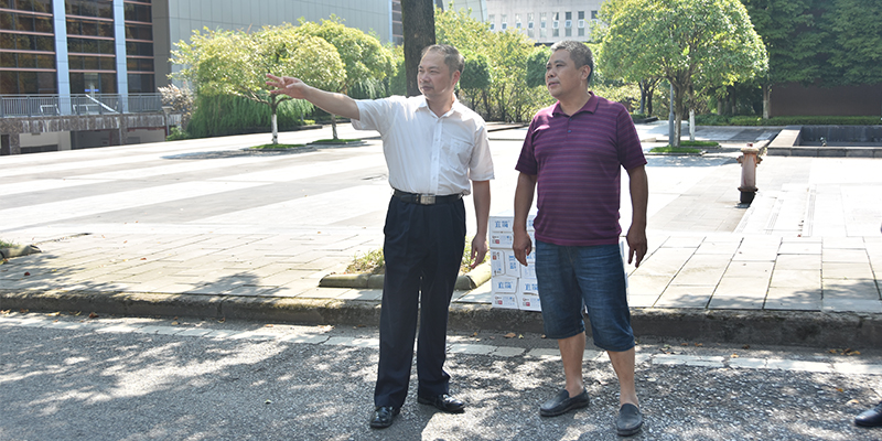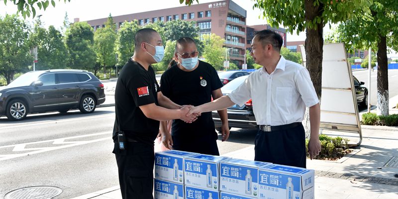 在学校南门,黄书记与安全管理处的职工亲切握手寒暄,为他们送上矿泉水消暑。黄书记指出,校门是学校疫情防控的第一个“关口”,全体安保人员要将责任记在心里、扛在肩上,做好对进出校园的人员、车辆的检查登记,严格落实各级防疫要求,为校园构筑一道安全的防疫屏障。
