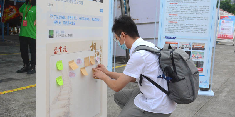 文学院、传媒学院在迎新点放置了“朋友圈”合影板,新生及家长们纷纷拍照留念,分享与众不同的“朋友圈”,留言板上写满了2021级新生对未来四年的无限期待,也意味着开启了他们的大学生活。