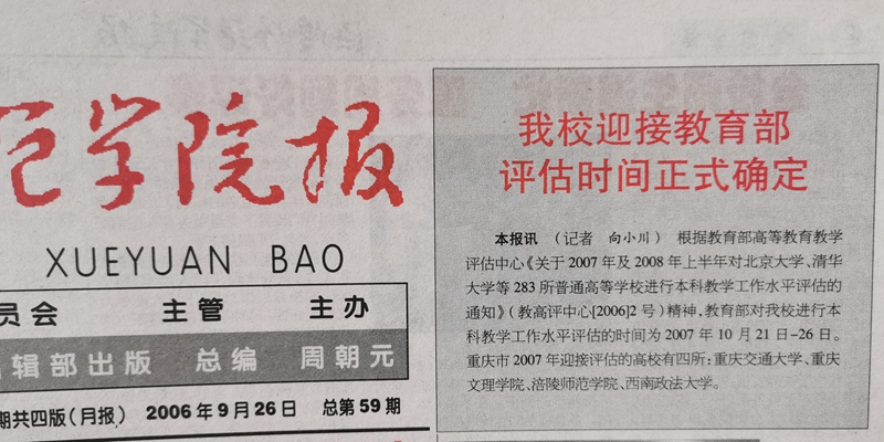 2006年9月,《涪陵师范学院报》刊发的我校接受本科教学水平评估时间的消息