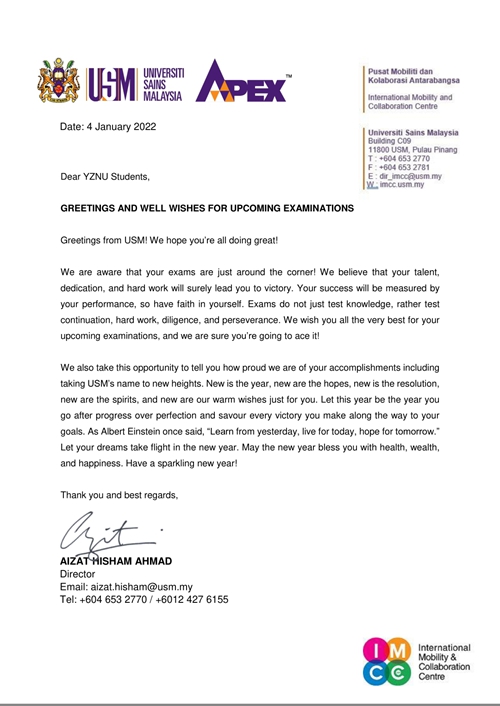 1月4日,马来西亚理科大学国际处处长艾扎特·希沙姆·艾哈迈德代表该校致信我校土木工程(中外合作)专业学子,感谢同学们的新年祝福,并向我校师生致以新年问候和美好祝愿。此前,我校土木工程(中外合作)专业学子精心制作了祝福视频,通过网络向马来西亚理科大学校方及授课教师送上新年祝福。