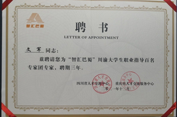 近日,马克思主义学院文军教授获聘“智汇巴蜀”川渝大学生职业指导专家团专家,将面向川渝大学生提供职业指导和就业创业服务。