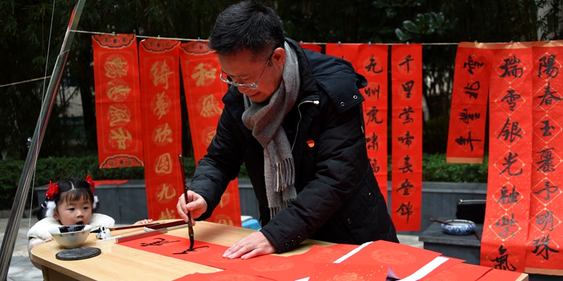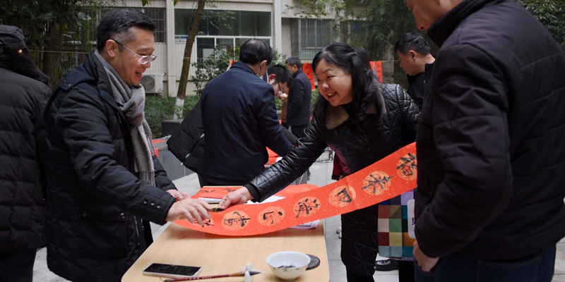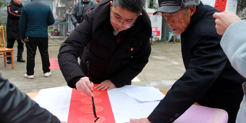 1月9日,美术学院党总支部分师生党员前往丰都县保合镇盖灵庙村,开展“百副春联助力乡村振兴”活动。美术学院党总支负责人傅小彪、教师党员李象松和两名学生党员挥毫泼墨,为盖灵庙村村民送上亲笔书写的祝福。村民们在现场欣赏书法作品,并热情地与师生们寒暄,活动现场热闹非凡,洋溢着喜庆的氛围。