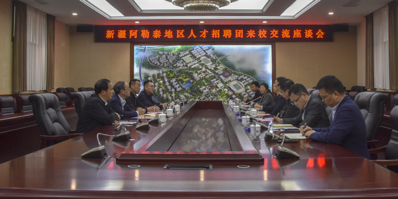 4月18日下午,新疆阿勒泰地区人才招聘团到我校考察交流,座谈会在致远楼525会议室召开。阿勒泰地委委员、组织部部长王君安,组织部副部长、人社局党组书记、副局长张华勇,人社局党组成员卢开伦,我校校长蔡家林、副校长杨双,招生就业工作处、发展规划处等职能部门负责人参加座谈会。杨双主持会议。