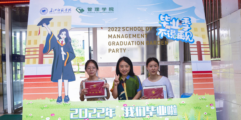 管理学院门口设置了毕业合影框,毕业生和师长们在毕业框里合影,定格大学时光难忘的一刻。该院还为每位毕业生定制了主题为“爱出发”的镭射袋作为毕业礼物,镭射袋上印着管理学院的院徽及院训,蕴含着祝福2022届毕业生的人生旅途如镭射包般绚丽多彩的深意。