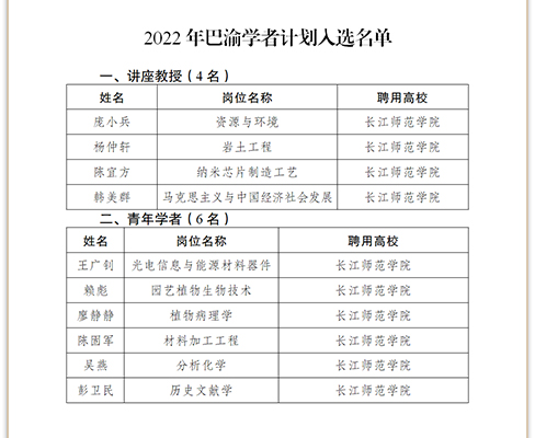 近日,市教委发布了2022年巴渝学者计划入选名单,我校10名优秀教师入选本年度巴渝学者计划,获批数量居于同生态院校首位。至此,我校已有13名巴渝学者特聘教授、13名巴渝学者讲座教授、21名巴渝学者青年学者,巴渝学者总量达47人。
