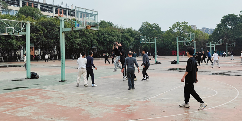 运动场上师生挥汗如雨,空气中洋溢青春活力。