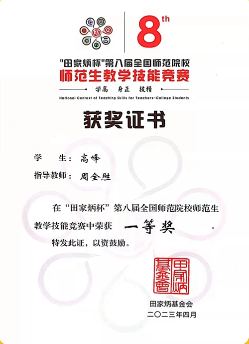 日前,由全国地方高等师范院校教务处长联席会议主办、“田家炳基金”冠名、浙江师范大学承办的“田家炳杯”第八届全国师范院校师范生教学技能竞赛落下帷幕。我校参赛学子斩获2个一等奖、2个二等奖、3个三等奖和1个优胜奖,其中,思想政治教育专业学生高峰、化学专业学生肖光燕荣获一等奖。