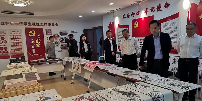 在南苑八舍学生社区,陈光海观看了我校学子的书画作品,走访察看了新型学生社区的建设发展情况,并与在场师生亲切交流。