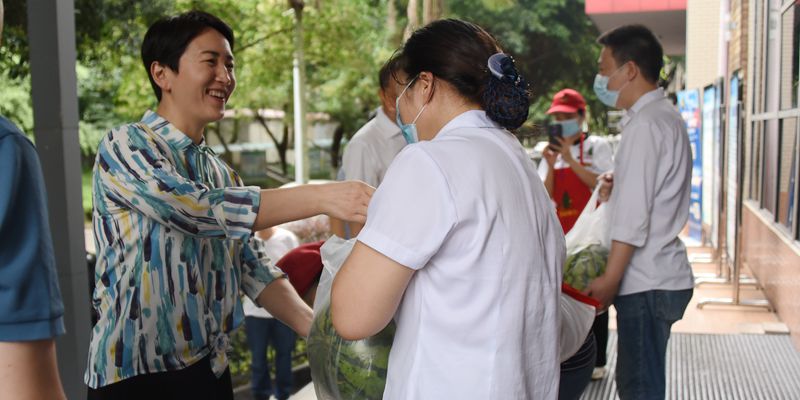 在校内在建工地,黄大勇、杨燕滨为工人们送上消暑解渴的西瓜,并询问项目施工进度和运行情况。黄大勇要求,施工单位要保证施工质量,把握好工程进度,确保按时保质保量完成施工任务。他还提醒施工人员,一定要做好防暑降温工作,合理安排工期,确保人身安全和施工安全。