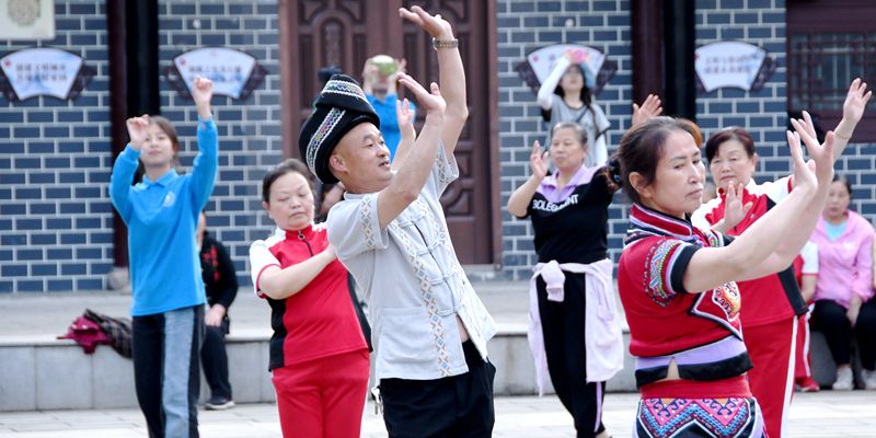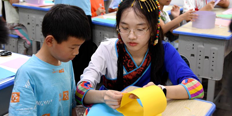 在民族文化广场,志愿者们认真学习集歌、舞、乐、剧为一体的摆手舞,摆手舞传承人谯乾树更是手把手指导,为年轻人们讲解摆手舞的起源、发展历史、舞蹈特色。志愿者们学习、传承着传统民族文化,同时也开设国学经典课堂,增强少年儿童的民族认同感,厚植“爱我中华”的种子。志愿者们把师范教学技能运用在系列教学活动里,改编歌词、互动表演、知识竞答,用丰富的教学方式讲授经典诗词、各民族的文化特色,带领孩子们感受中国剪纸的魅力,制作手工T恤介绍恒合乡水果产业......