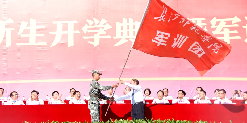 党委书记黄大勇为2023级新生军训团授旗,承训单位代表接旗。
