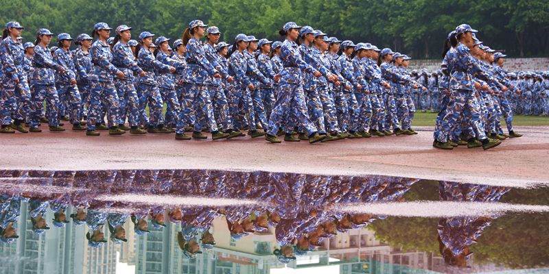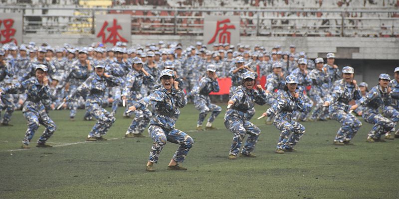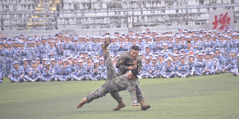 擒敌拳方阵、手势操方阵、匕首操方阵先后展示了摔擒、武术、格斗、战术等内容,同学们坚定的目光、热血的嘶吼、整齐的动作,饱含着军训14天以来的汗水与成长,展现了长师学子朝气蓬勃、奋发向上的精神风貌。