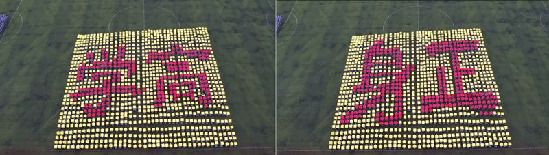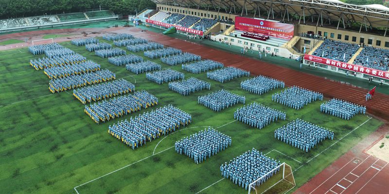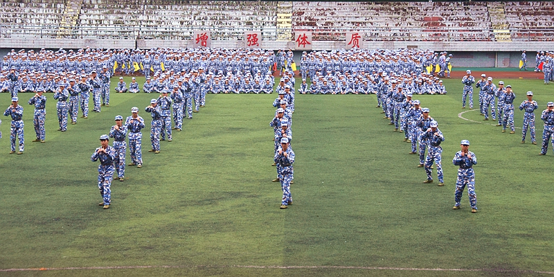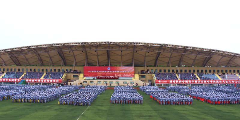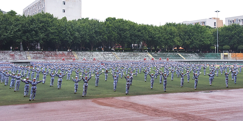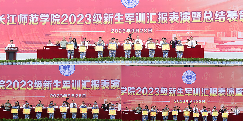9月28日上午,2023级新生军训汇报表演暨总结表彰大会在行健体育场举行,现场军歌嘹亮、掌声雷动,4900余名长师新生英姿飒爽地汇报军训成果。表演方阵用手中的色板快速演示“我爱你中国”等字样,庆祝中华人民共和国成立74周年。