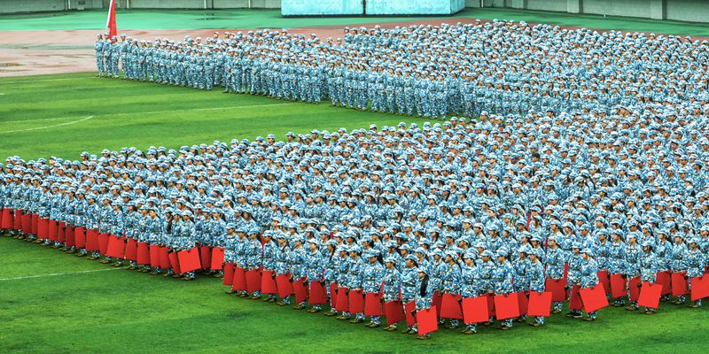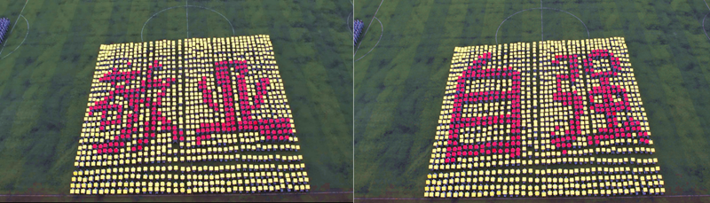 表演方阵将现场气氛推向高潮,1200名受阅新生以绿茵为背景,伴随着鼓点声,快速翻动手中的红黄彩板,逐一展示“1931—2023”“学高身正 敬业自强”“我爱你中国”等字样,深情展现长师建设发展的光辉历程,把庆祝国庆节与新生军训、爱国教育与校史教育完美融合,全场师生倍受鼓舞、掌声此起彼伏。
