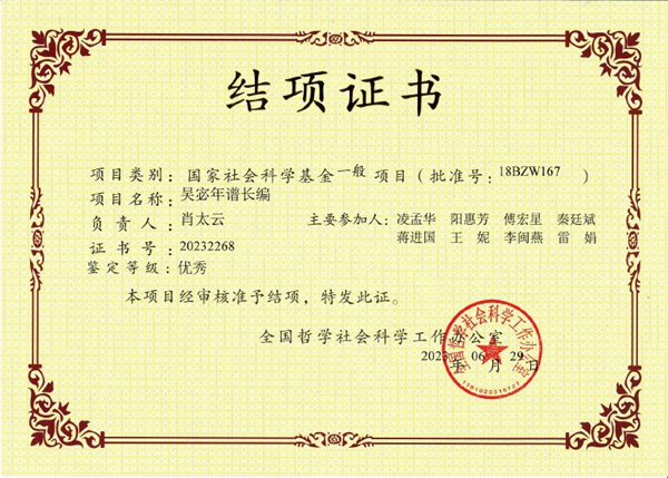 近日,我校文学院教师肖太云主持的国家社科基金年度项目“吴宓年谱长编”(证书号:20232268)以“优秀”等级顺利结项。全国哲学社会科学工作办公室此次共验收389个项目,获优秀等级项目34项。
