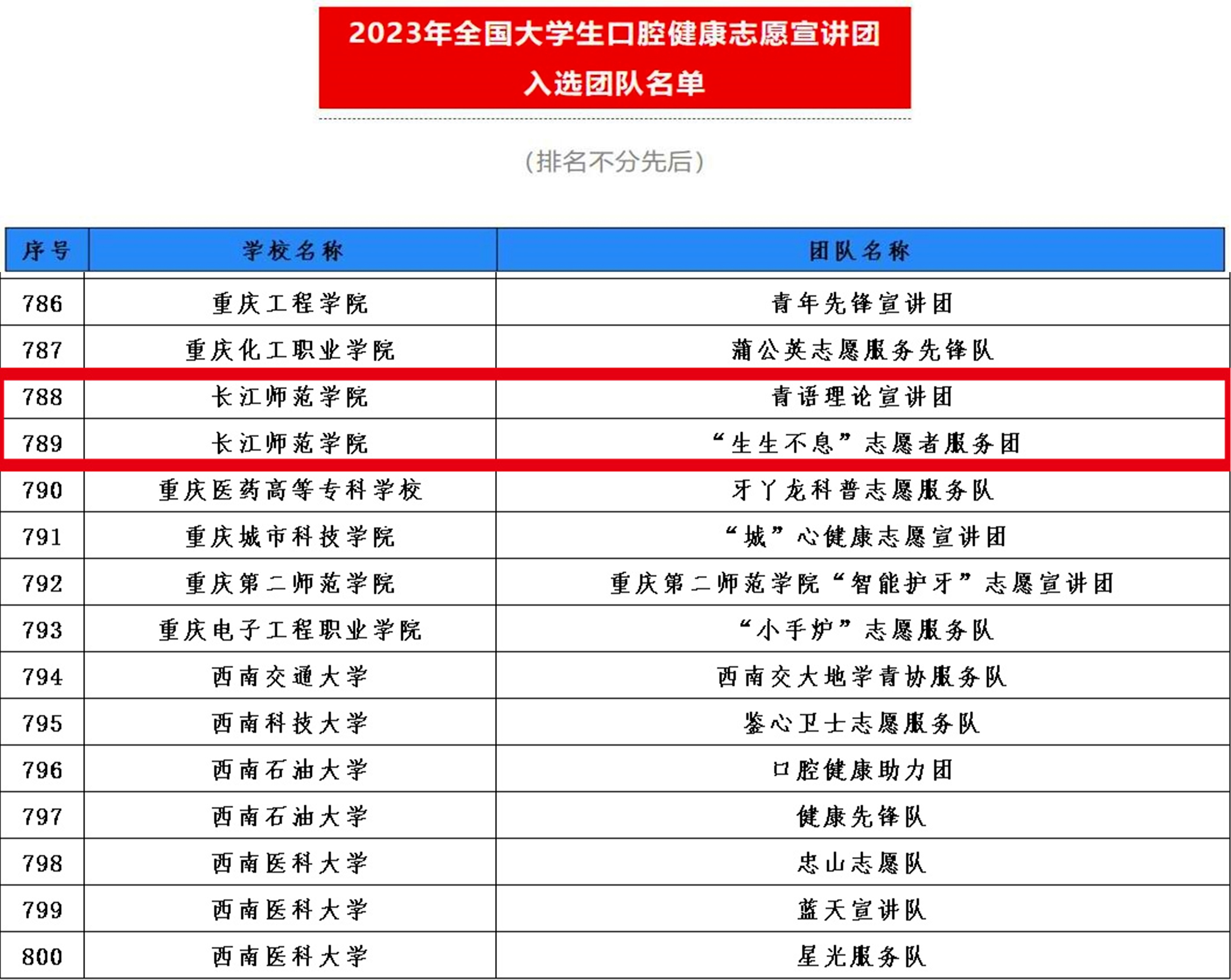 10月20日,由团中央青年志愿者行动指导中心、国家卫生健康委医疗应急司联合开展的2023年全国大学生口腔健康志愿宣讲活动公布了入选团队名单,政治与历史学院青语理论宣讲团、现代农业与生物工程学院“生生不息”志愿者服务团成功入选。