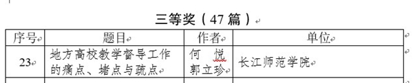 自评选活动启动,我校党委高度重视,教学质量监测研究与评估中心积极落实、广泛宣传、精心谋划,研究论文《高校课堂教学质量评价的调查研究》《新时代背景下高等学校教学督导队伍建设的思考》获评二等奖、《地方高校教学督导工作的痛点、堵点与疏点》获评三等奖。